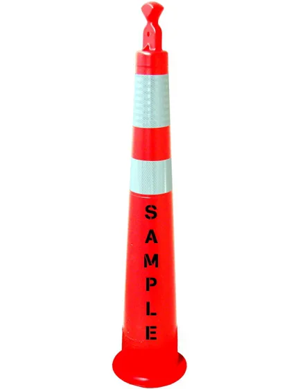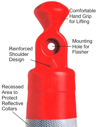 The 42" Grabber Cone is tough, lightweight, and stands a full 48" tall when measured to the top of the handle. A thoughtfully designed handle makes this delineator tube easy to grab and lift from a moving vehicle. The recessed bolthole, beneath the handle, allows you to attach barricade flashers (sold separately). The 16 lb. recycled rubber base detaches for easy storage. Available with or without 6” and 4” high-intensity reflective collars. Custom lettering stenciled for no additional set up fee. Ships immediately.